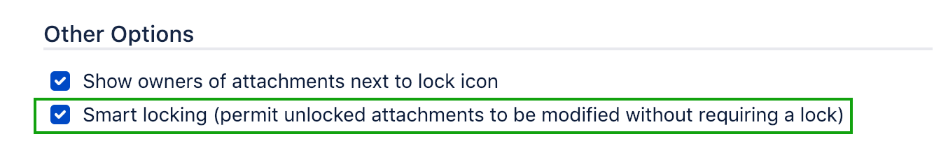 The Smart Locking option enables Cenote Lockpoint's smart, automatic locking function, allowing you to control Lockpoint's behavior when users try to update an attachment that they have not explicitly locked. Although Lockpoint uses seamless locking when editing attachments through Edit in App and Edit in Office, users may sometimes need to upload or manually update attachments through drag-and-drop, the attachments macro, or other locations in Confluence.