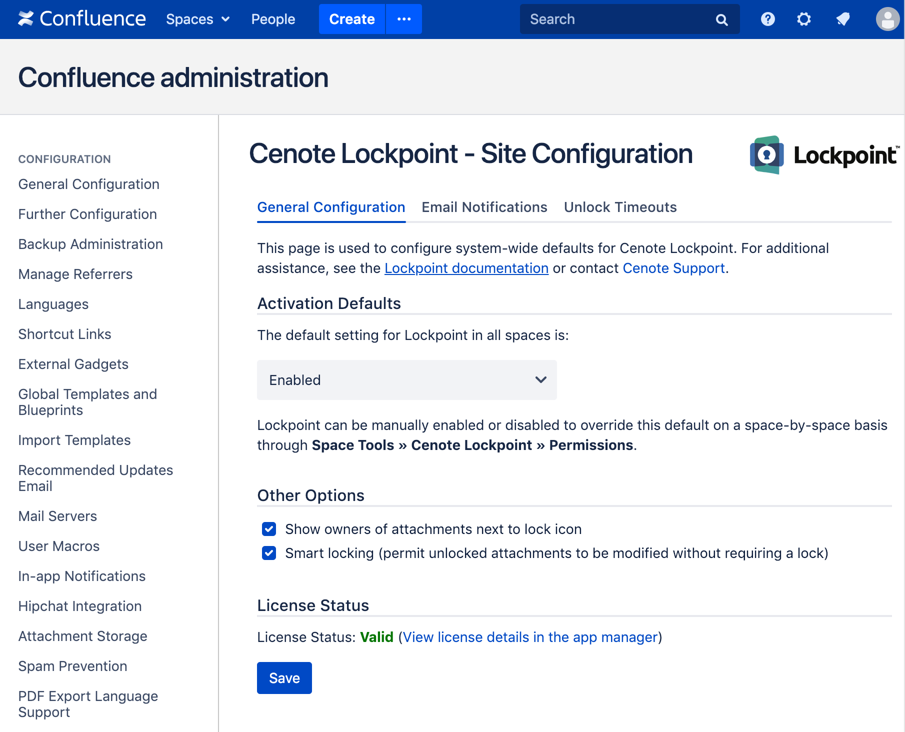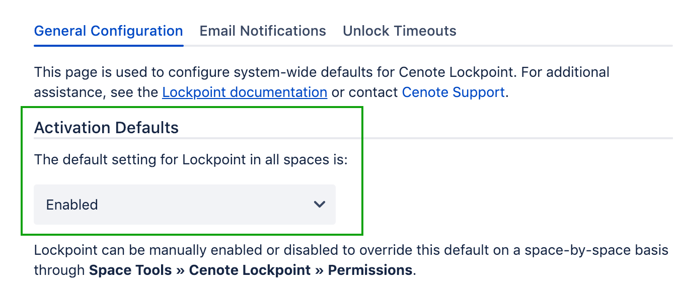 The Activation Defaults allow administrators to choose whether to have Lockpoint enabled or disabled by default for all Confluence spaces.