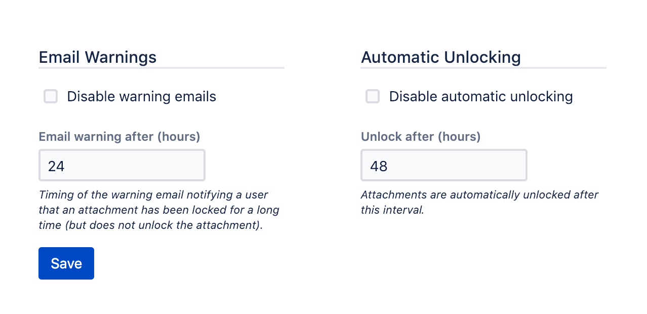 By default, if an attachment has remained locked for too long, Lockpoint will automatically send an email reminder to the lock owner. Spaces automatically default to the value configured in the global Lockpoint configuration. To change this timing for this space only, adjust the number of hours in the Email warning after (hours) field and click Save. Alternatively, to disable warning emails entirely within this space, select the Disable warning emails checkbox.