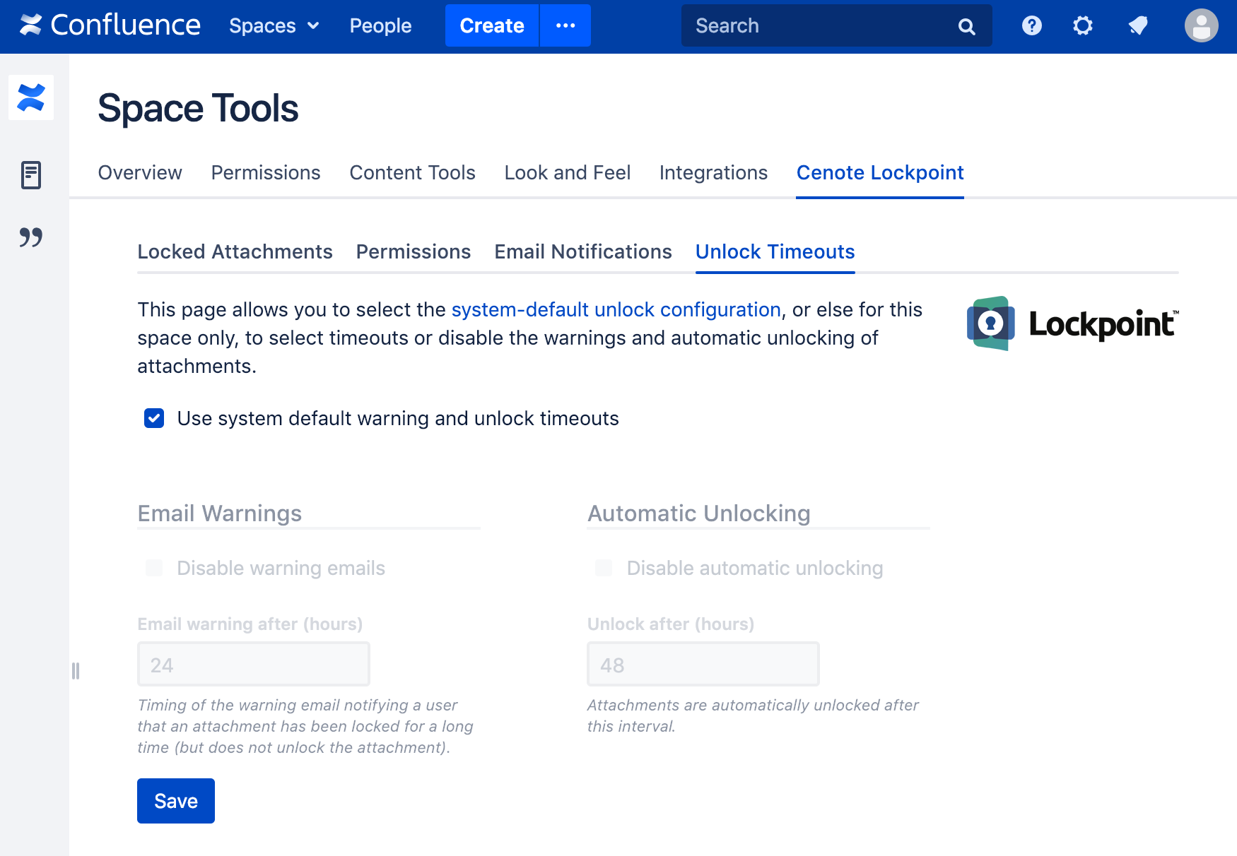 The Space Tools » Cenote Lockpoint » Unlock Timeouts tab allows you to adjust the timing used when sending notifications to users about attachments that have been locked for too long, and also to adjust the interval used by (or disable) the automatic unlocking feature. Lockpoint uses the globally-defined unlock timeouts unless the values are overridden in a specific space.