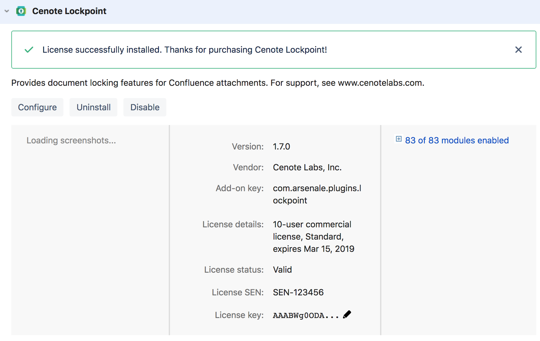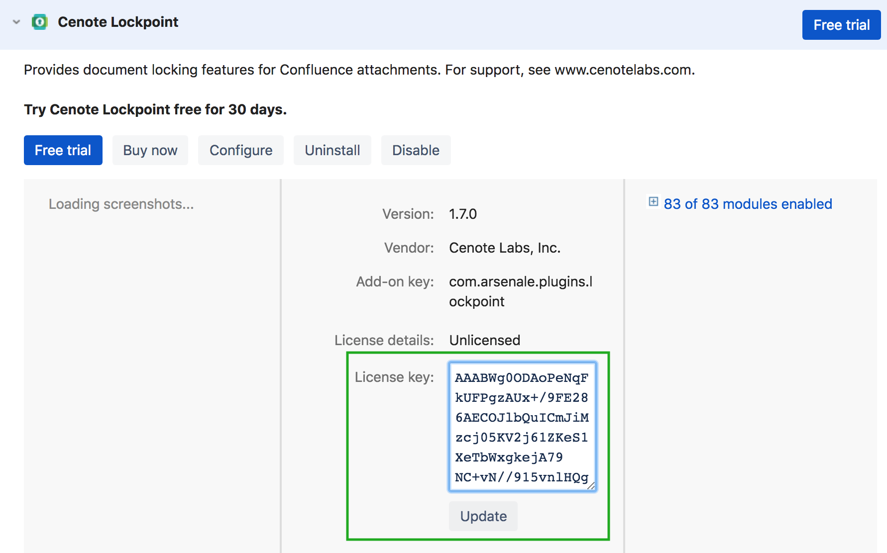 To apply an Atlassian-issued Lockpoint license in Confluence, copy the Lockpoint License Key from your My Atlassian account to the Cenote Lockpoint License Key text box on the Manage Apps page in Confluence Administration and click the "Update" button.