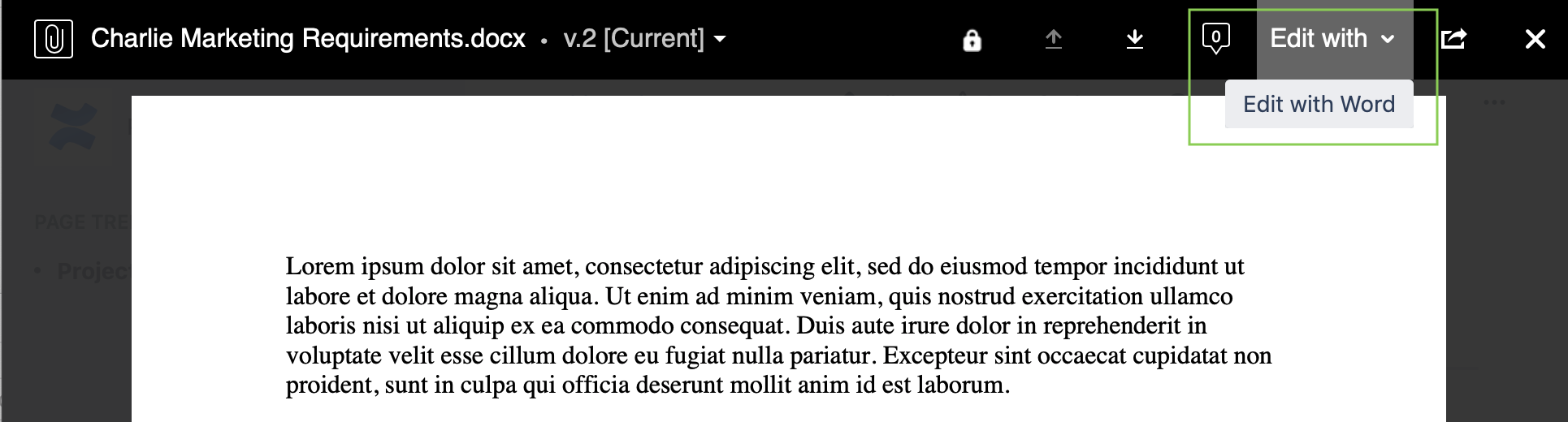 Confluence 6.10 and below support an alternate Edit in Office feature, which allows the direct editing of Microsoft Office documents. This feature is also available on later versions of Confluence (6.15 and 7.1+), if your system administrator has decided to enable the Edit in Office dark feature. When enabled, the Edit in Office button can be used in conjunction with a supported Office application to edit documents.