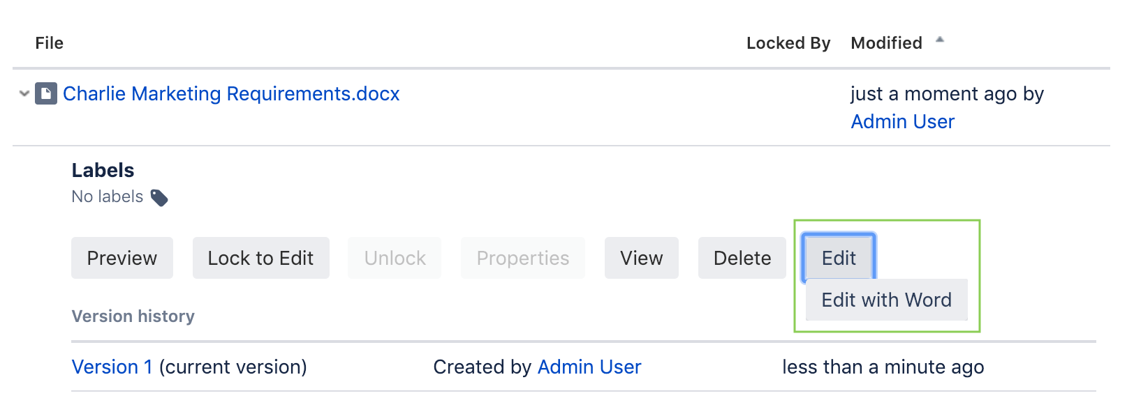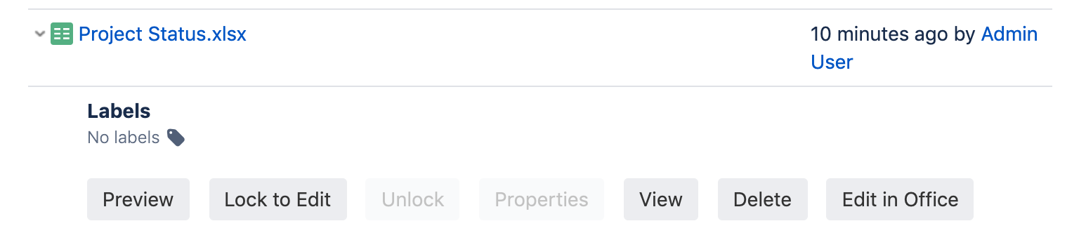 The Edit in App feature is available from all locations in Confluence, including the Attachments macro, the Confluence Previewer, from the various Office view file macros, and the Attachments page.