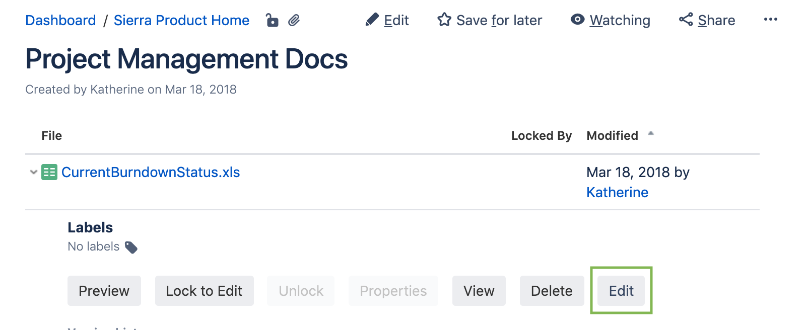 To edit an attachment from these locations, click the Edit button. Lockpoint will automatically lock the attachment when it is opened and the Locked By column in the Attachment macro will be updated.
