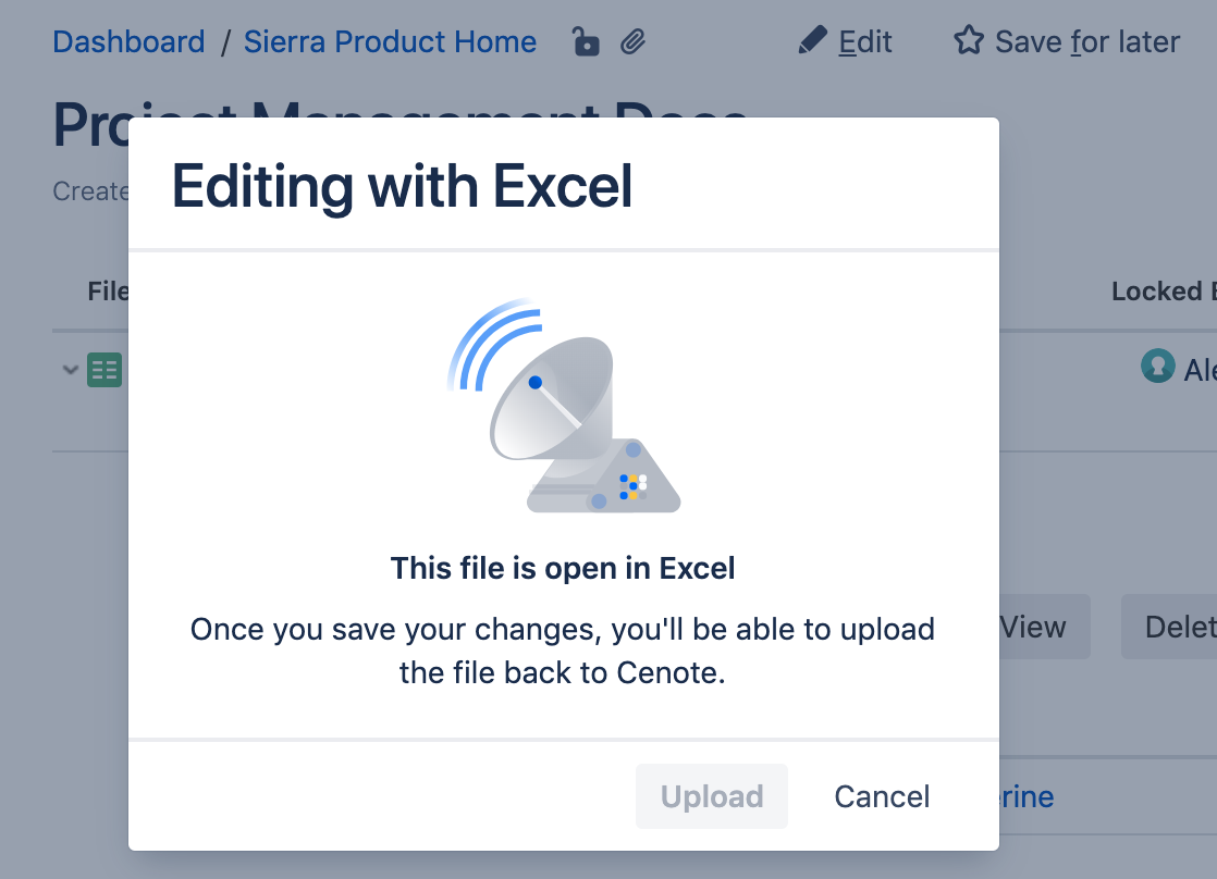 When editing an attachment with Confluence 7.2 or prior, the uploading of documents is managed through the Confluence page itself, rather than through the Companion app described above for Confluence 7.3+. After your editing application is launched, the Confluence page will display a new upload dialog. Once you have saved the attachment with your editing app, click the Upload button to upload the document to Confluence, and the attachment will be automatically saved and unlocked.