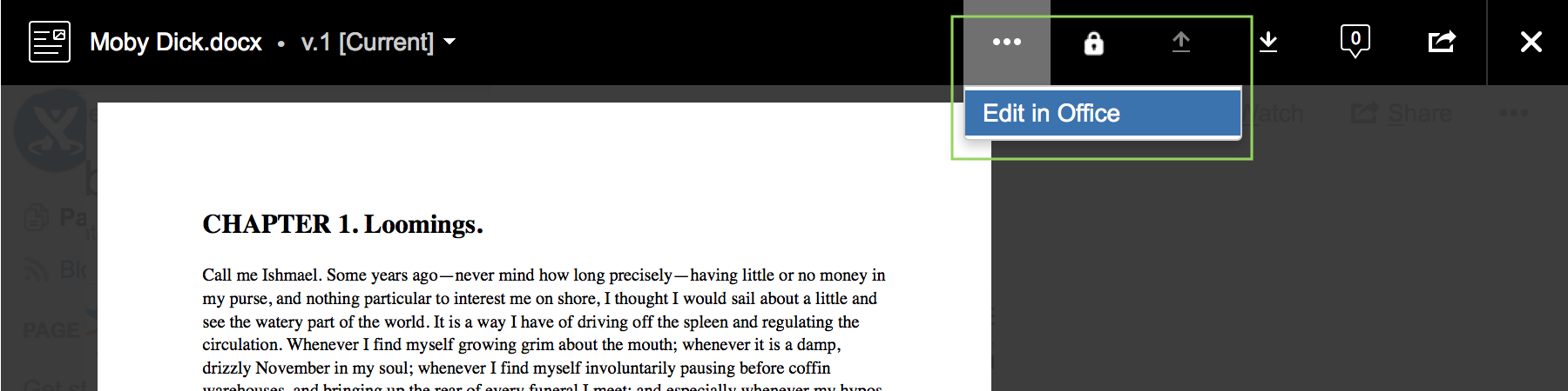 For Confluence 6.0 through 6.11, or on Confluence 6.15 and 7.1+ (if enabled by your system administrator as a dark feature), the Edit in Office feature is accessible under the "..." dropdown, and then clicking Edit in Office. This option is only displayed for Microsoft Office documents when using a browser supported by the Atlassian Office Connector. Attachments are also automatically locked and unlocked using Edit in Office, without the need to manually click the Lock or Unlock buttons.