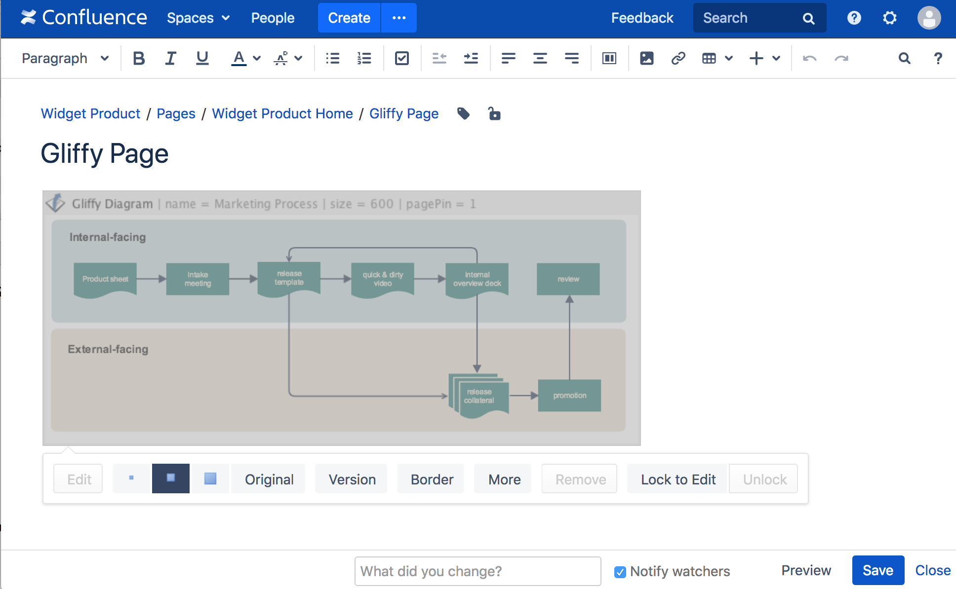 Gliffy documents are edited directly within the Confluence editor, and they can be locked and unlocked from within the editor. After clicking on a Gliffy diagram, the editor toolbar appears. Click on Lock to Edit to immediately lock the diagram, and then on Edit to launch the Gliffy editor. When finished editing, the same editor toolbar can be used to unlock the diagram.